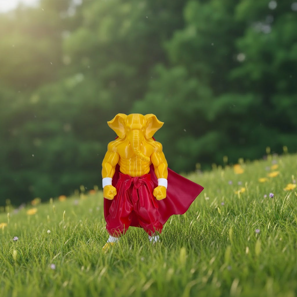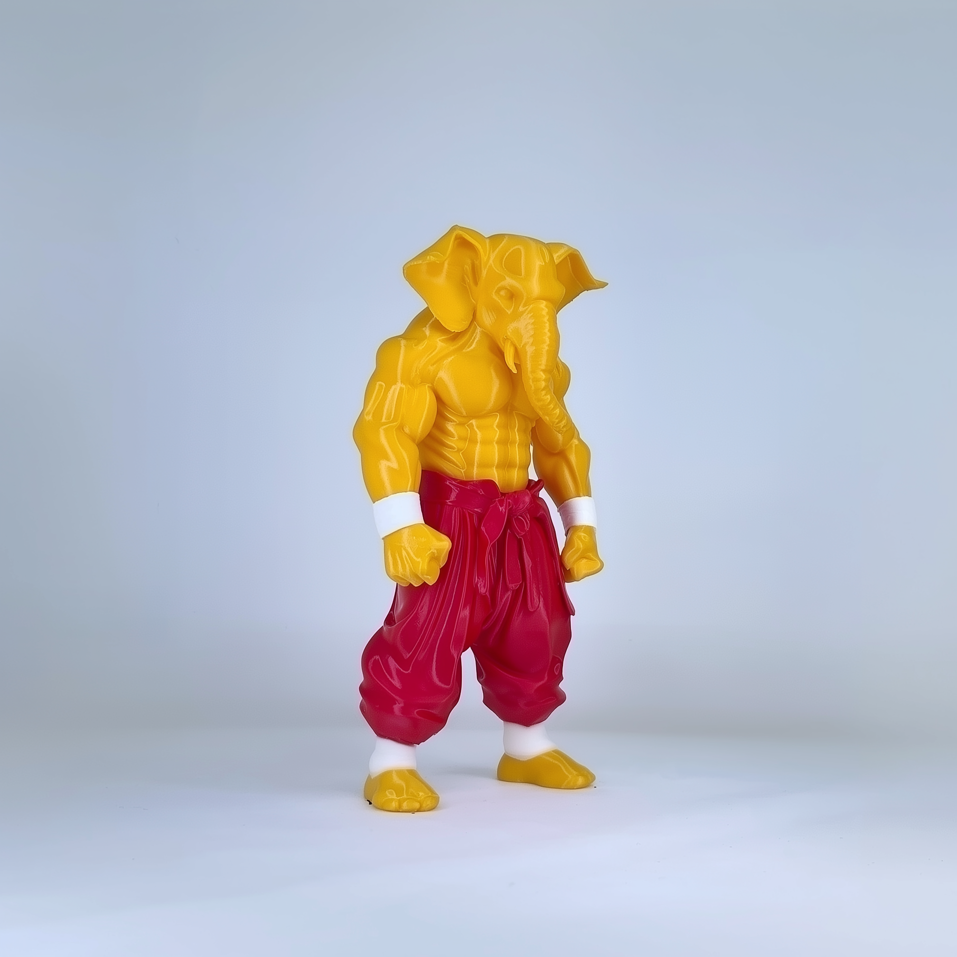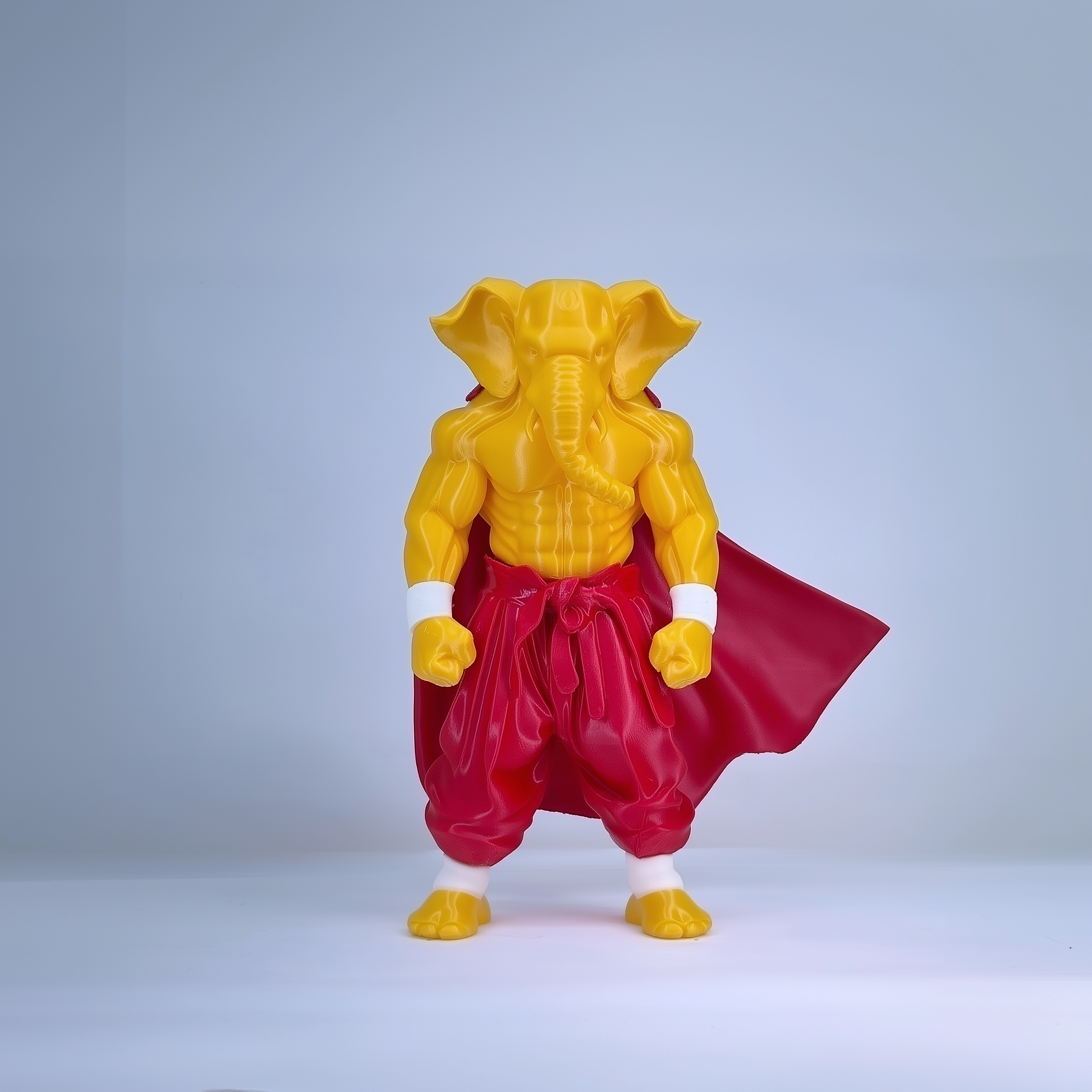 A vibrant 3D Warrior Ganaveera dressed in yellow pants, radiating positivity, energy,. Crafted with modern AI artistry while rooted in tradition, this figurine is perfect for housewarming gifts, birthday return gifts, festive hampers, and kid's toys. A unique collectible symbolizing blessings and joy.
