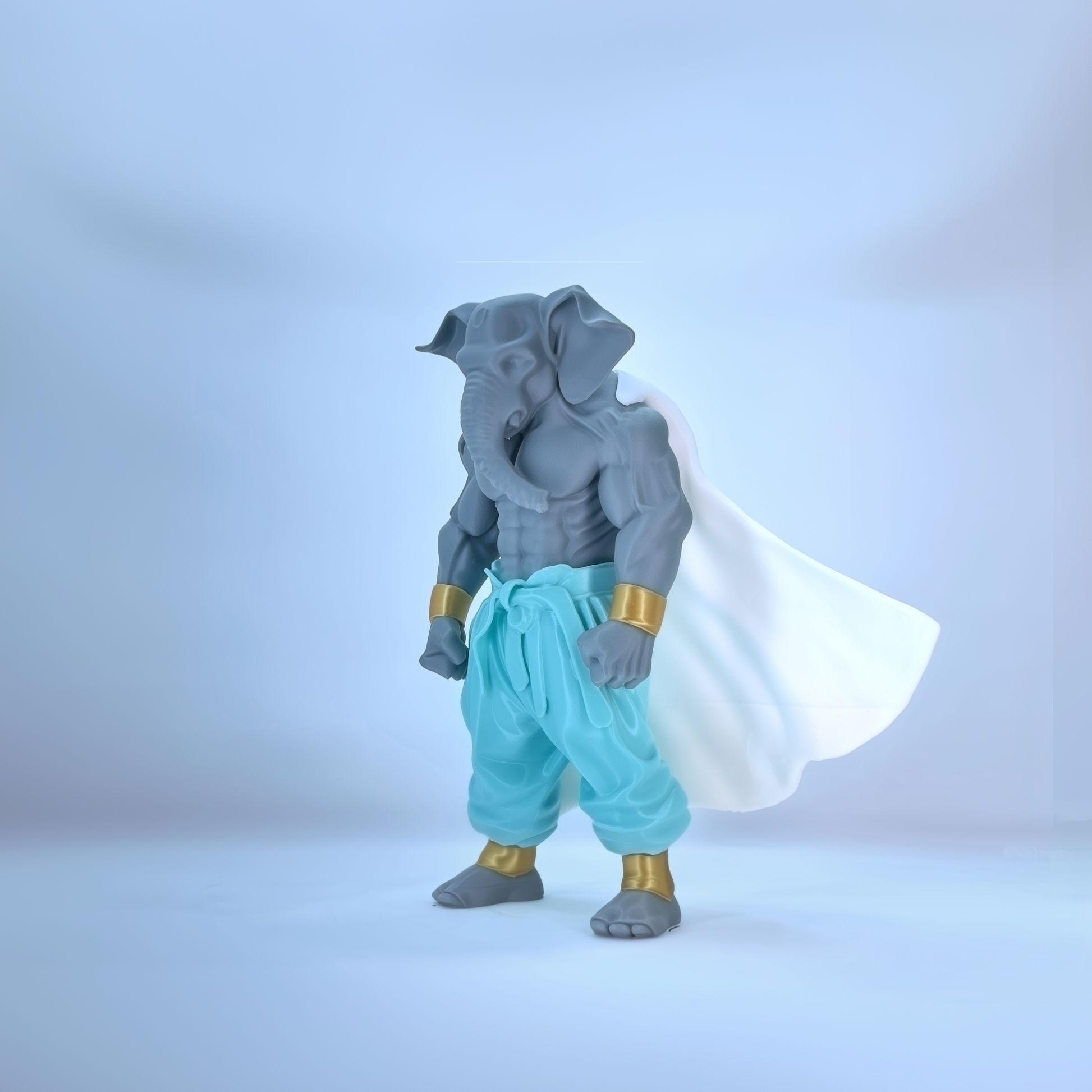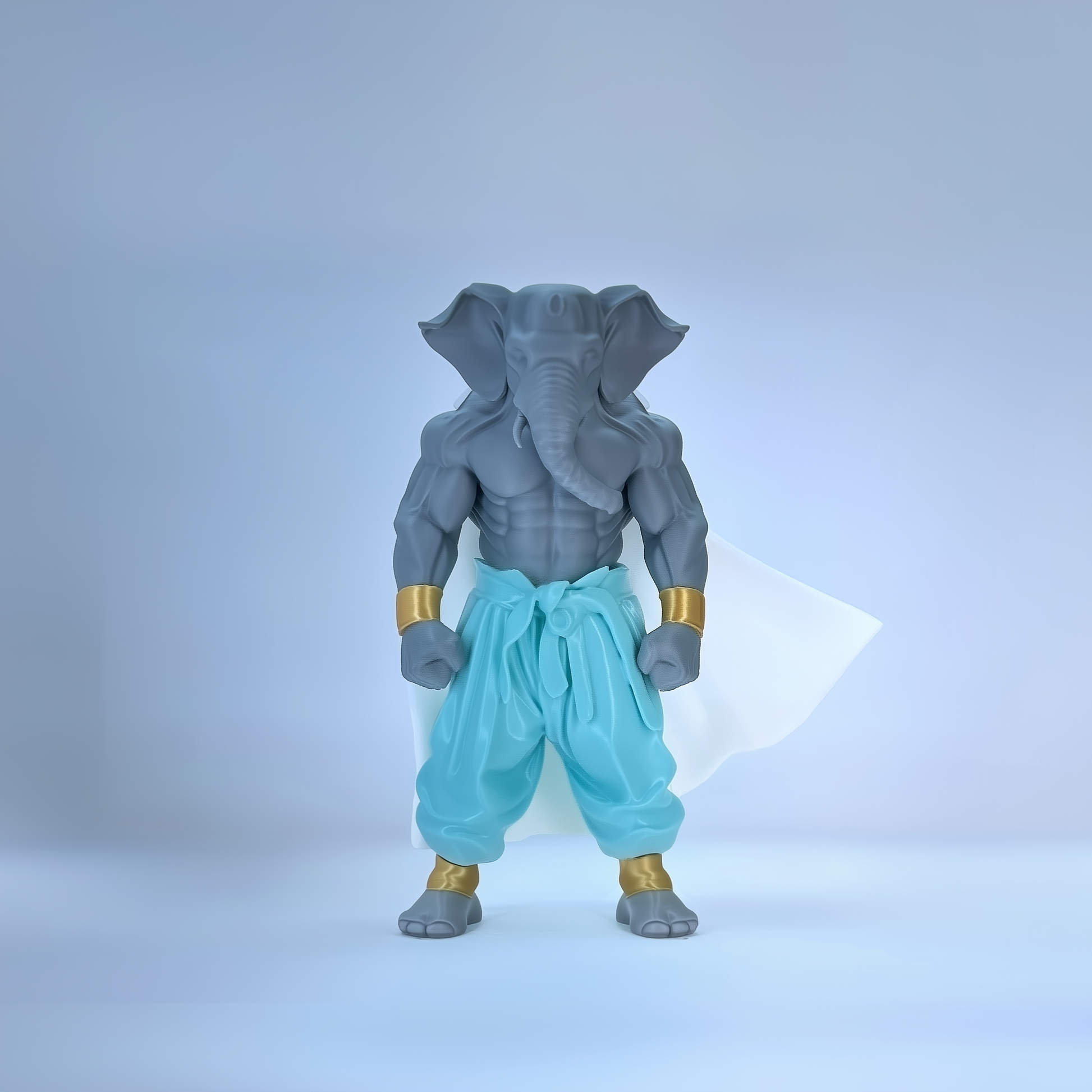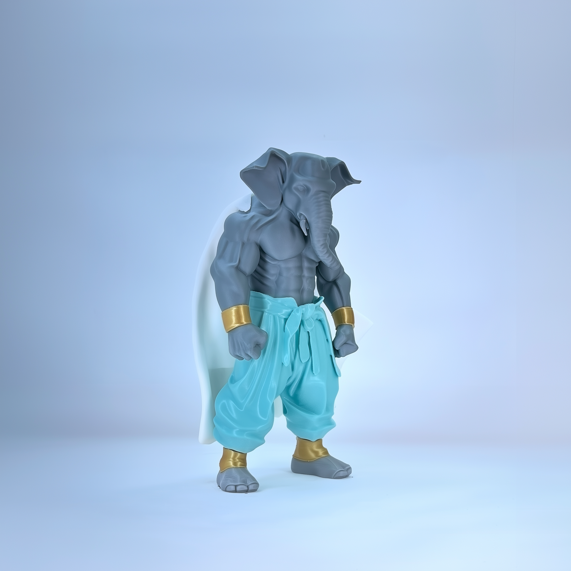 This Grey Warrior Ganaveera Figurine blends tradition with a modern warrior look. Featuring a strong grey body, aqua pants, and a majestic white cape, this idol represents balance, wisdom, and power. Perfect as a decor centerpiece or a thoughtful gift, it radiates strength and spiritual energy.