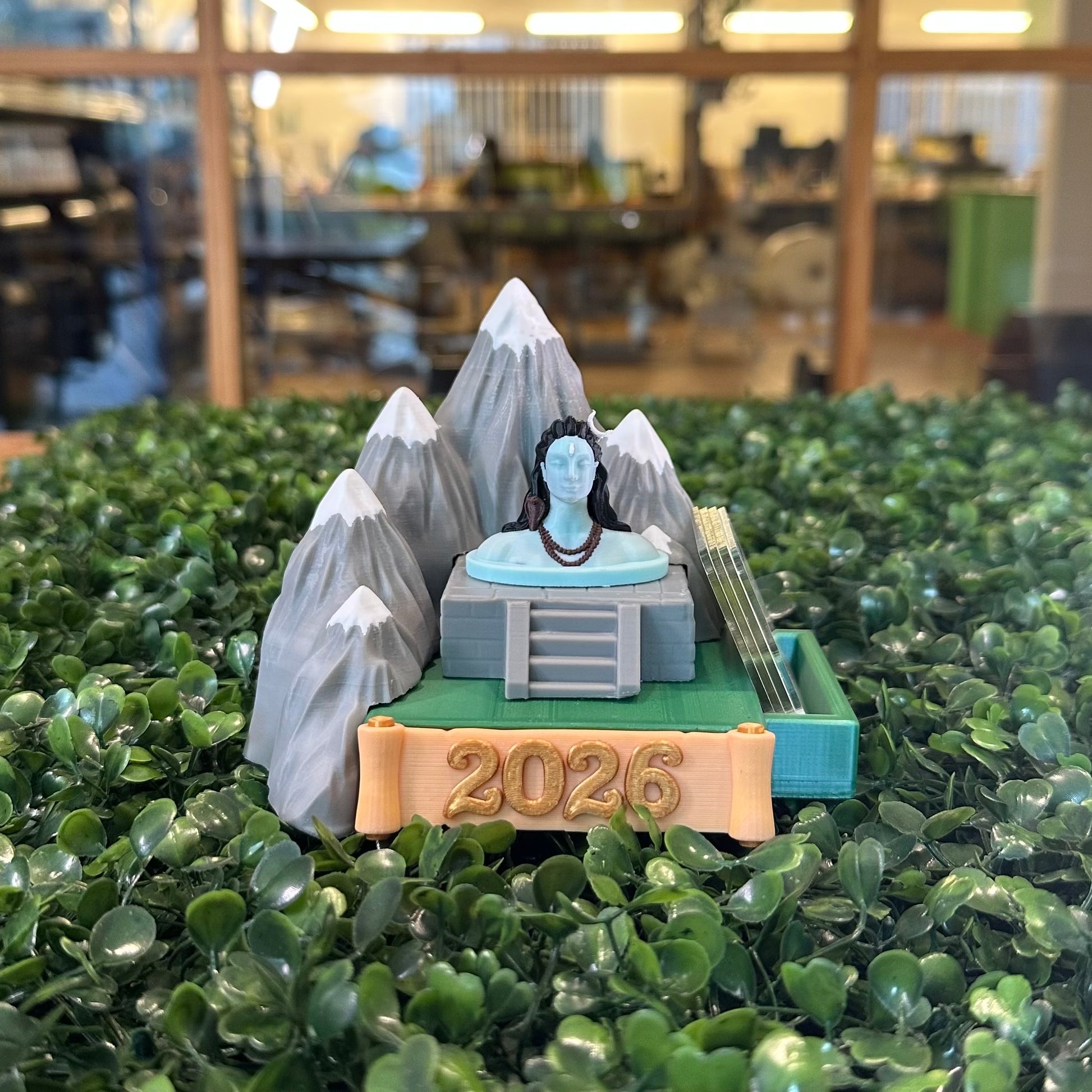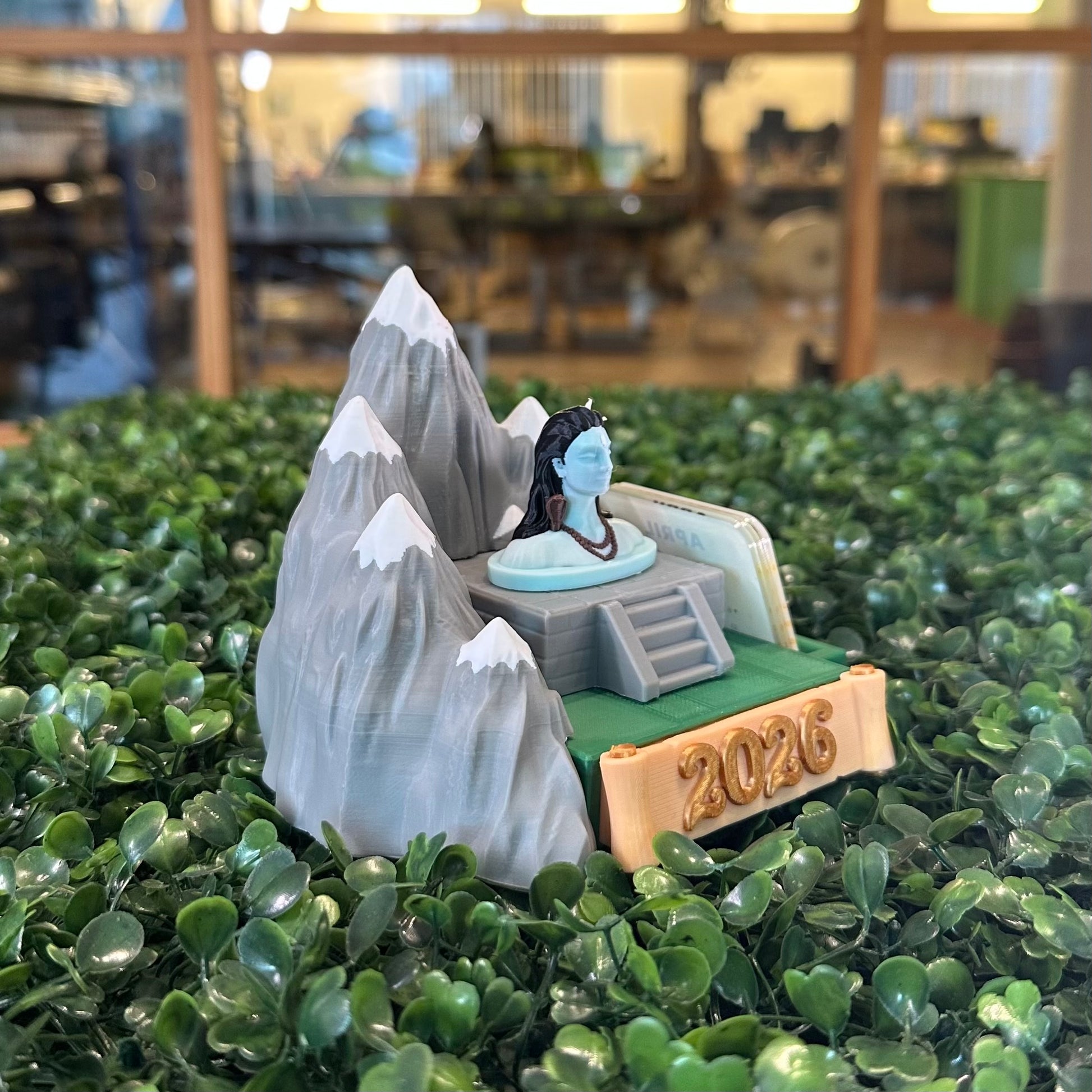 At the center rests Lord Shiva emerging from the mountains, symbolizing endurance, detachment, and composure. The sculpted Himalayan backdrop and stepped base represent the inward journey toward focus and awareness.